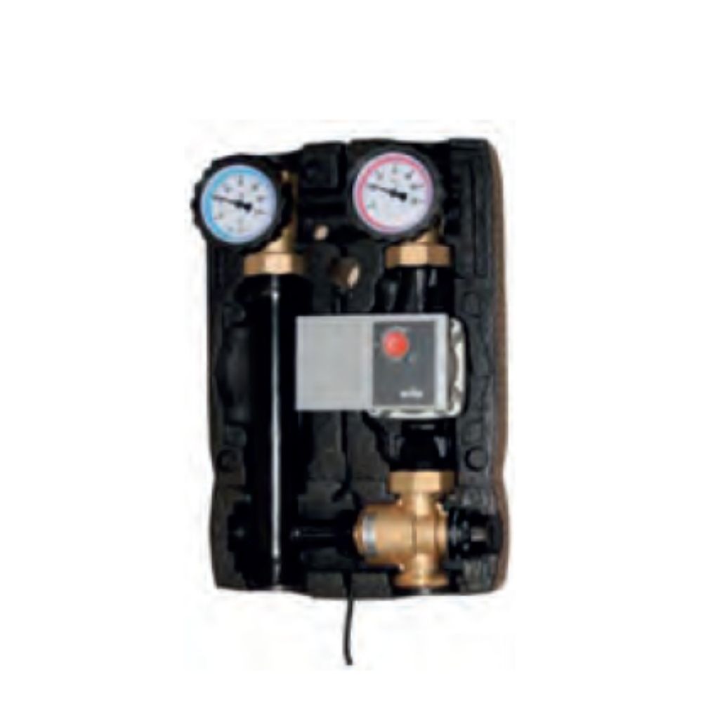 Grupo de mistura composto por uma válvula termostática, uma linha de descarga com válvula de esfera, uma bomba de circulação e uma válvula com termômetro de descarga e retorno 0-80 ºC .